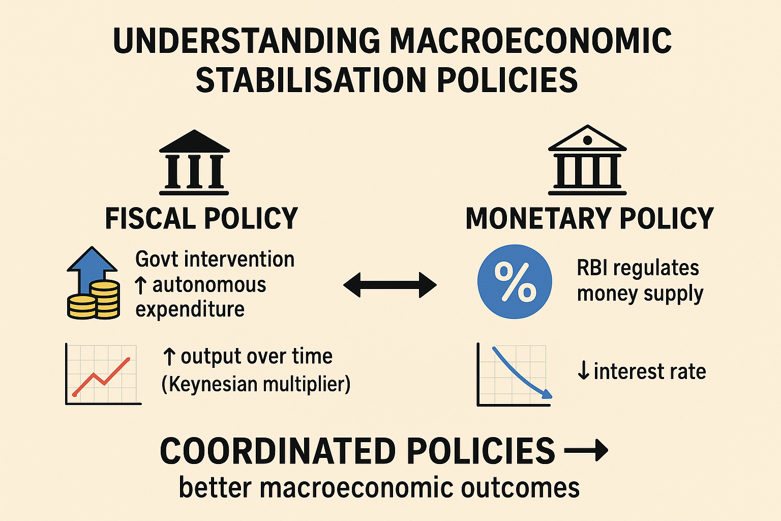 If fiscal expansion leads to higher interest rates, the RBI can offset this by increasing money supply, thereby easing interest rates and supporting investment. In this way, effective coordination between fiscal and monetary policy can produce better macroeconomic outcomes.